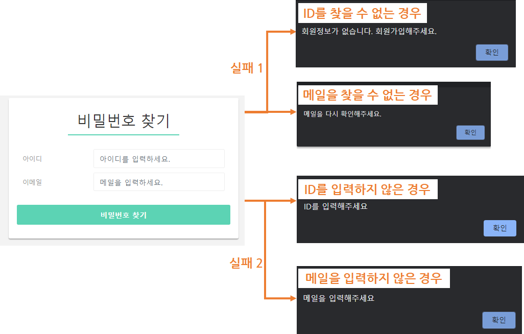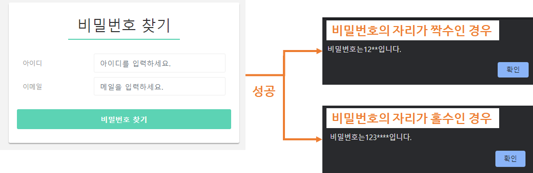 비밀번호 찾기를 메일로 전송하는 방식이 아닌, 비밀번호 절반을 직접 나타내주는 형태로 구현했다.